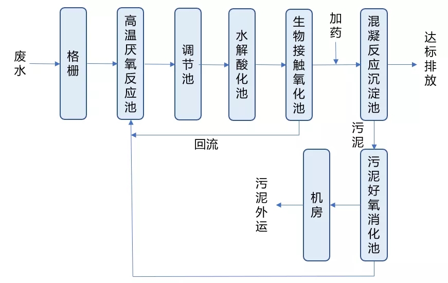 (2)高溫厭氧反應(yīng)池。經(jīng)過(guò)格柵處理的廢水流入高溫厭氧反應(yīng)池,再將處理后的水經(jīng)反應(yīng)池頂部的排水管流入調(diào)節(jié)池。高溫厭氧反應(yīng)池用高溫水廢水高溫厭氧發(fā)酵預(yù)處理發(fā)酵過(guò)程可以有效地降低廢水的色度,提高廢水的生物降解性,溫度下降幾小時(shí)后廢水生物接觸氧化池的水循環(huán),從而實(shí)現(xiàn)廢水生物接種的水稀釋廢水中污染物的濃度,減少水處理的難度,降低運(yùn)行成本,確保出水符合標(biāo)準(zhǔn)。